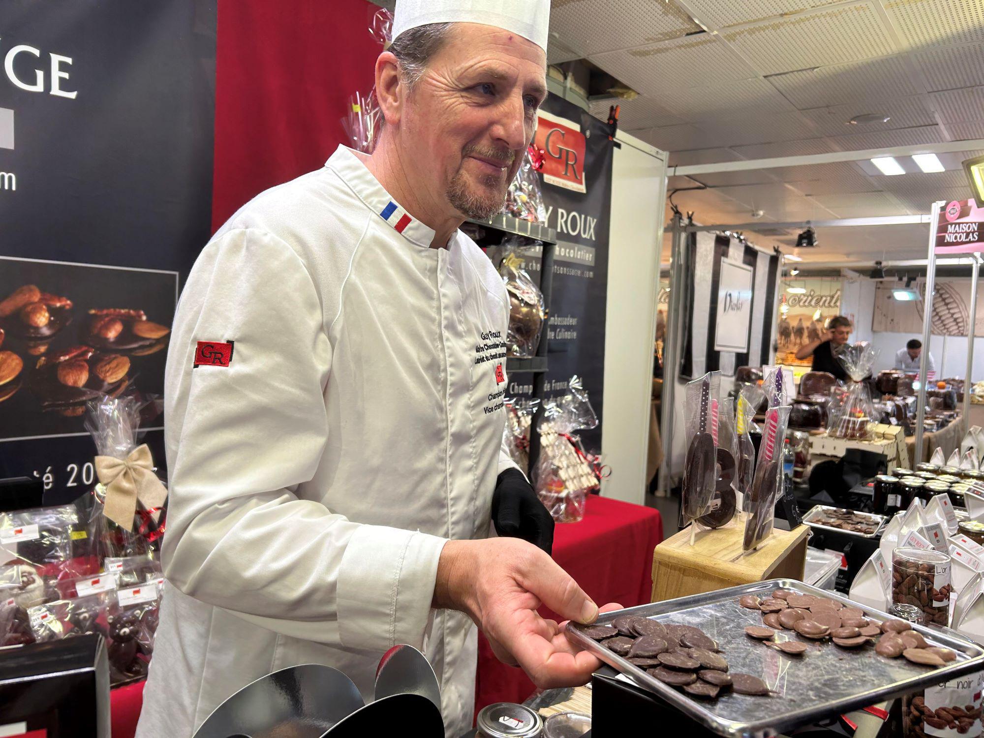 Cette année, le salon accueille plusieurs invités d'honneur. Et nous allons pouvoir voir ces artisans à l'œuvre dans leur art avec des démonstrations. Le Champion du monde du pain au chocolat, Sébastien Lagrue, réalise ses viennoiseries en direct dans un laboratoire de boulangerie reconstitué sur place par Corse Boulangerie.