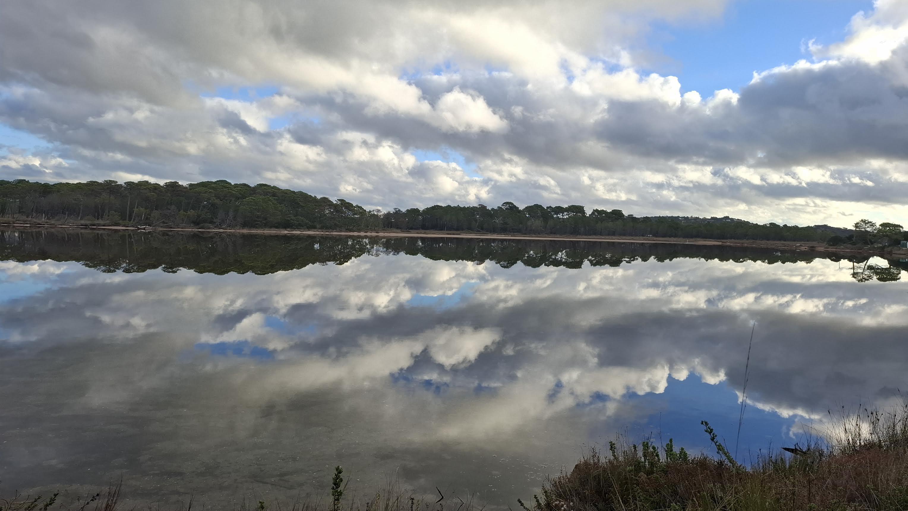L’étang du Benedettu, situé sur la commune de Portivechju, est une lagune côtière bordée de pins et de maquis. Par temps calme, sa surface lisse renvoie le ciel comme un miroir. Ce jour-là, les nuages bas et les éclaircies s’y reflètent presque à l’identique, donnant au paysage une impression de double horizon.