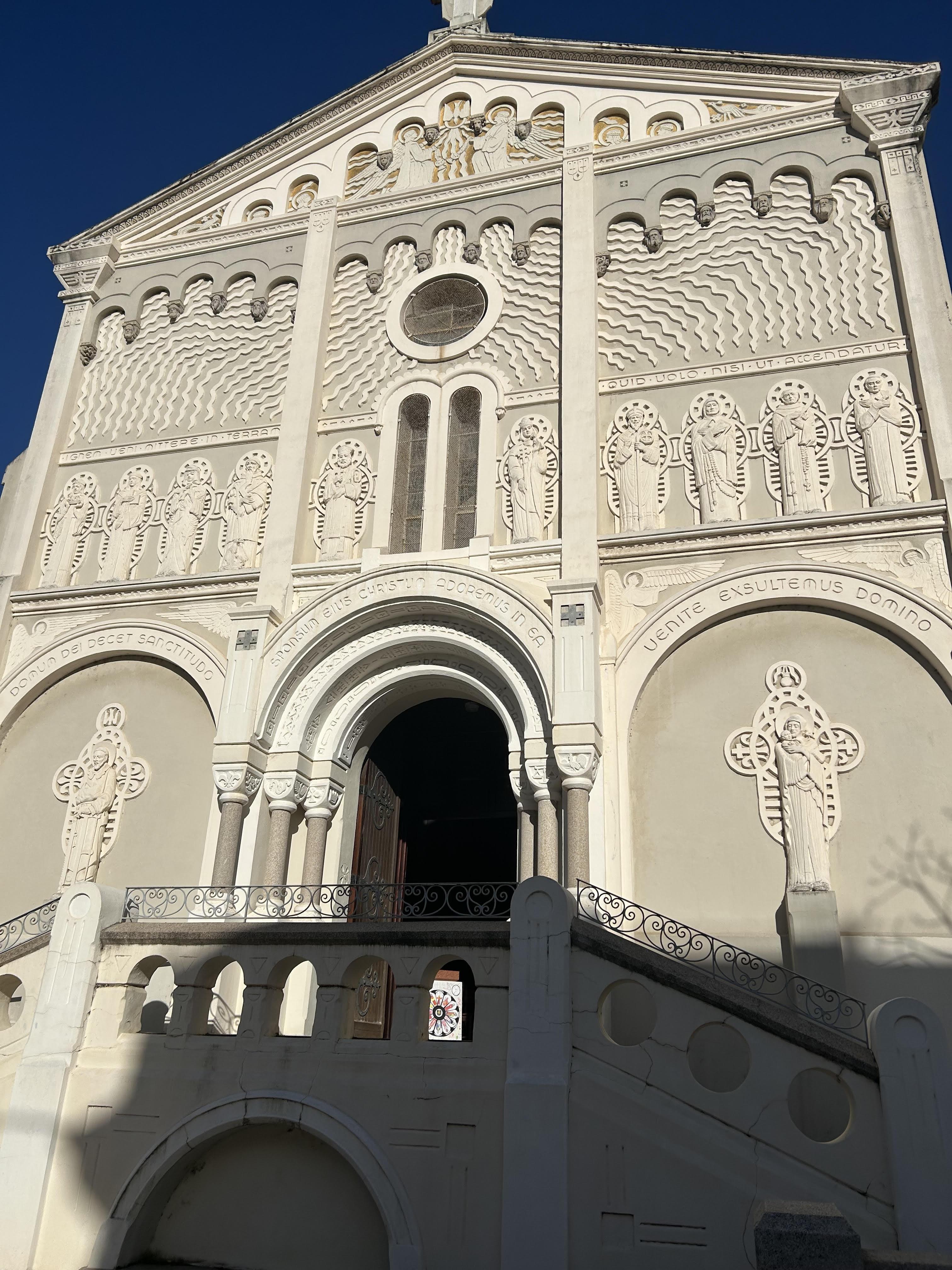 Quartier du Casone. A l'angle du boulevard Sylvestre-Marcaggi et de la rue Miss Campbell se dresse l'église du Sacré Cœur depuis les années 30 avec sa beauté architecturale, sa façade blanche travaillée, son entrée en arche et chapiteaux, ses sculptures et le Christ sur la croix haut dans le ciel. Chaque matin, les grandes portes de l'église s'ouvrent, pour le plus grand bonheur des visiteurs, des passants et des paroissiens. Une volonté du curé Ange-Marie Bastelica.