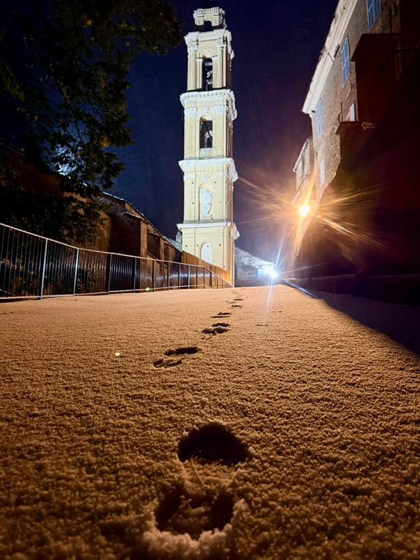 La tourmente de vendredi n'a pas épargné U Silvarecciu recouvert par un beau manteau de neige épais. Devant l’église San Sebastianu, le chemin poudré s’illuminait d’une lueur orangée, diffusée par les lampadaires. Quelques pas solitaires entaillaient la blancheur et glissaient vers le campanile, comme si quelqu’un avait traversé la nuit en laissant derrière lui l’ombre discrète d’un secret.