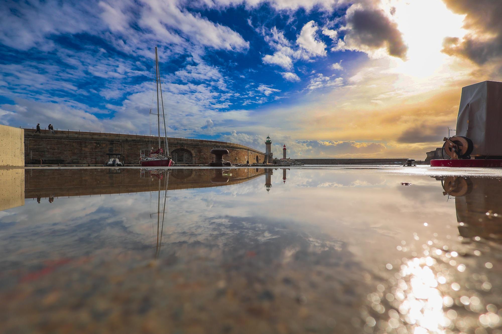 Dans l’objectif d’Hervé Tusoli, le plan d’eau du Vieux-Port de Bastia semble se changer en un large miroir, reflétant jalousement la toile bleue et dorée que dessine le ciel.