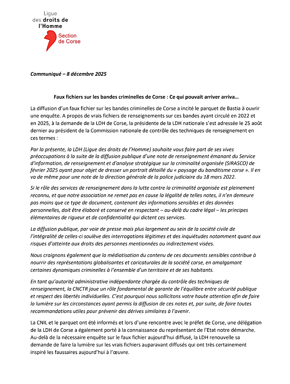 Le communiqué de la LDH Corsica
