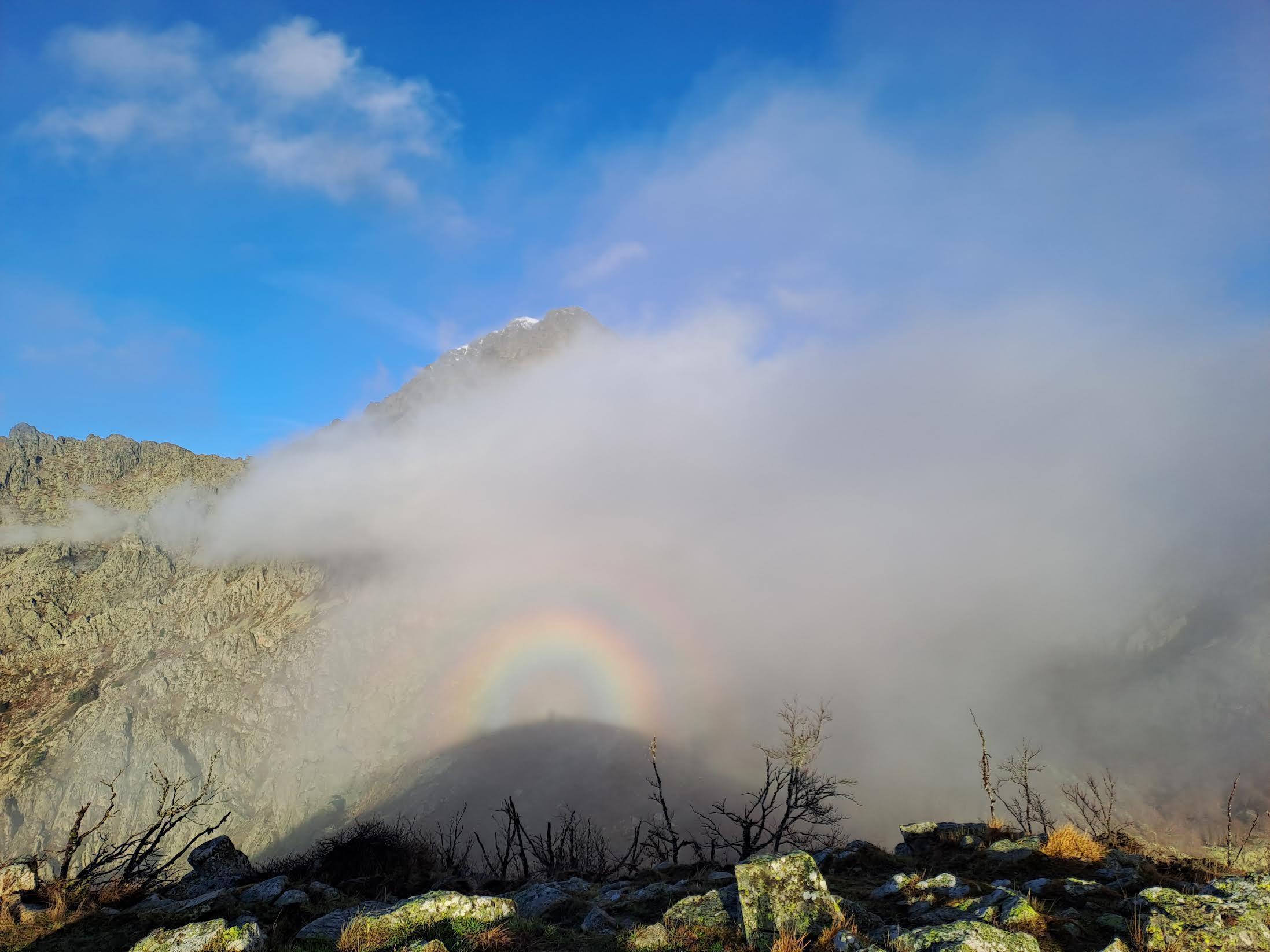 Au pied de la Punta Cancellone, un arc-en-ciel discret se dessine dans le voile des nuages, comme une respiration de lumière entre roche et brume. Un instant suspendu, fragile et silencieux, où la montagne semble rappeler que même dans la rudesse du relief, la beauté sait surgir sans bruit.