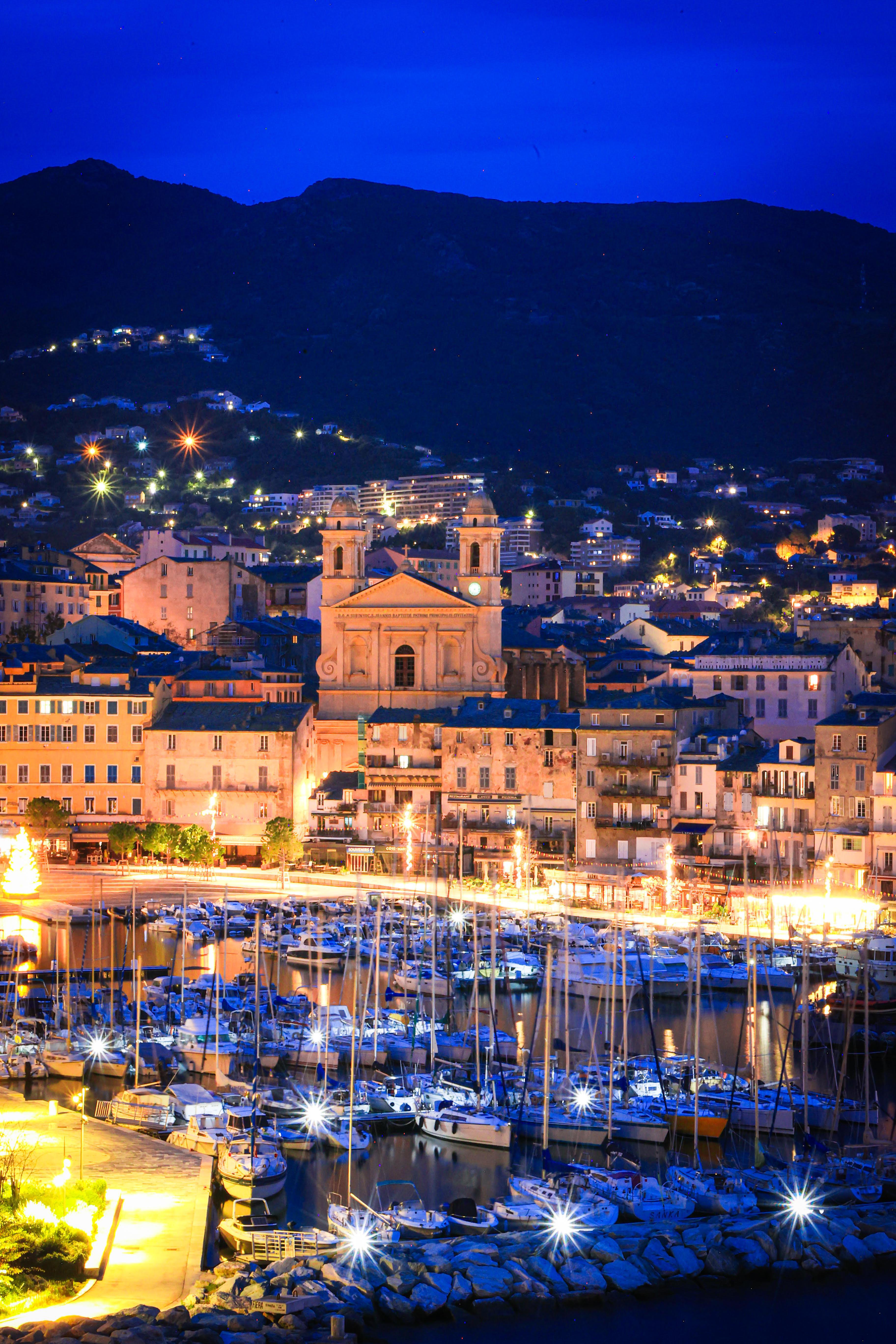 À la tombée de la nuit, la façade et le double campanile de l’église Saint-Jean-Baptiste (San Ghjuvà) se détachent au cœur de Bastia. Au premier plan, le Vieux-Port et ses mâts éclairés dessinent un paysage urbain emblématique illuminé et rénové, entre mer, patrimoine et premiers cpntreforts du Pignu en arrière-plan.