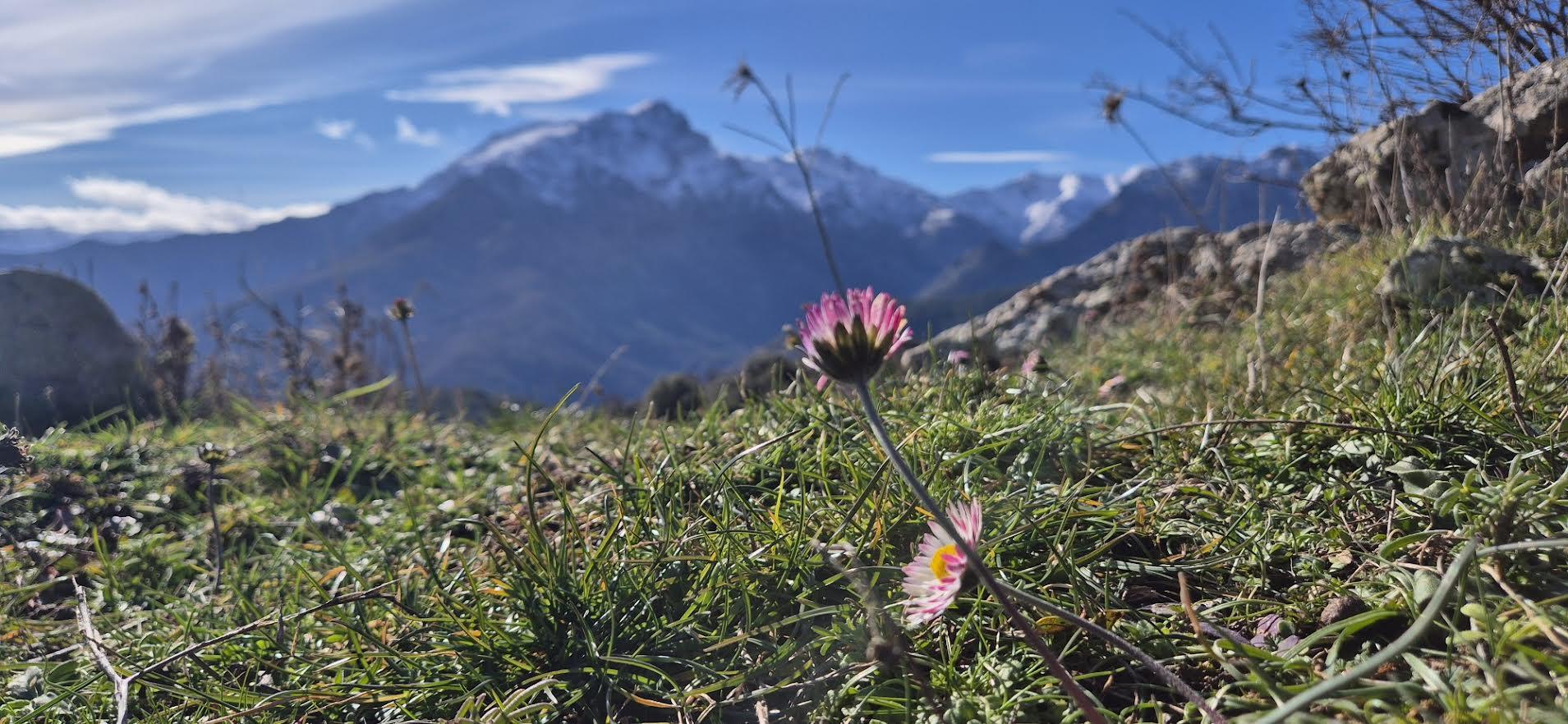 Dans l’herbe encore fraîche, les premières fleurs pointent discrètement, comme un signe patient du renouveau. Au loin, le Monte Pratu garde ses teintes d’hiver, mais la lumière, déjà plus douce, rappelle que la saison bascule lentement vers le printemps