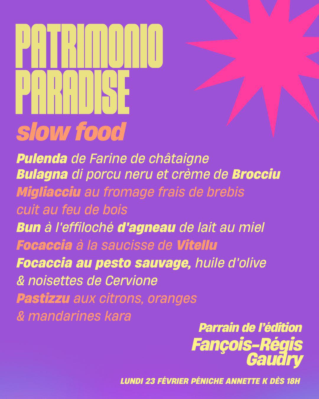 C’est bien l’avis de Pierre-François Maestracci, patron du Bistro Libertalia à Patrimoniu et l’un des promoteurs de la slow food en Corse, une cuisine traditionnelle en circuit court qui n’utilise que des produits de qualité, cultivés sur place. Il a, avec ces chefs, concocté un menu spécial pour l'occasion : « Nous avons créé un menu finger slow food - circuit court en partenariat avec l’Odarc, un menu que l’on peut manger debout et qui représente toutes les filières de l’île. La farine de châtaigne avec la pulenda, la charcuterie avec la bulagna, les fromages avec le brocciu et le fromage frais, l’agneau et le veau corses, le miel, l’huile d’olive, et les agrumes. Bien évidement les vins de Patrimoniu et toutes les bières artisanales de la fédération de la bière corse. Tous les produits cuisinés ont un label de qualité, ce sont tous des produits fermiers de petits producteurs. L’idée est de revenir à une logique de circuit court, de puiser uniquement dans le local et les produits de saison ». Le parrain de la manifestation est le journaliste, auteur et critique gastronomique d’origine corse, François Régis Gaudry, qui officie notamment sur France Inter, et dont la notoriété et l’exigence servent de caution à la manifestation. « On fait un off du salon de l’agriculture. Le mot off est important parce qu’on va cuisiner les produits, les sublimer et les présenter à un public corse ou parisien qui n’a pas forcément goûter de la pulenda ou des migliacci, des mets d’hiver peu connus à Paris », renchérit Pierre-François Maestracci.