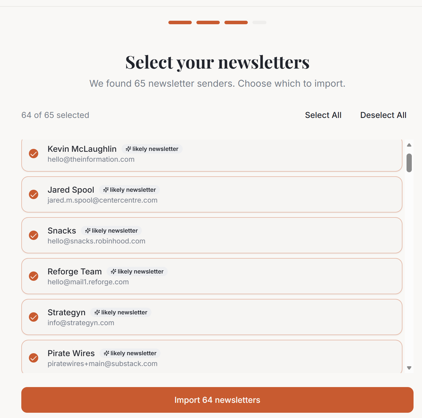Folio connects to your Gmail, automatically detects recurring newsletters in your inbox, and lets you select the ones you want to read into a separate reading space called Folio.