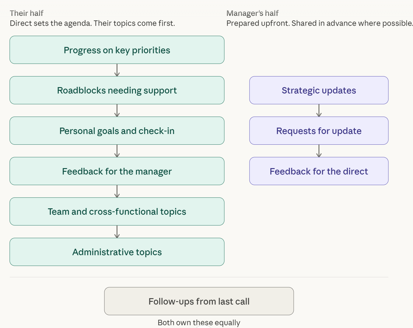 The direct report starts the 1:1, starting with progress on key priorities. This is not a status check, but to understand where the direct report is genuinely moving or stuck. Then roadblocks that need support, the things the direct cannot resolve without the manager in the room.